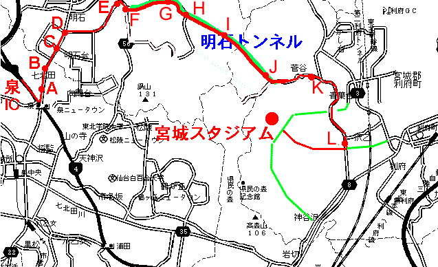 - L地点(菅谷台団地方面への右折)と、菅谷台団地内で2カ所、宮城スタジアムの前1カ所